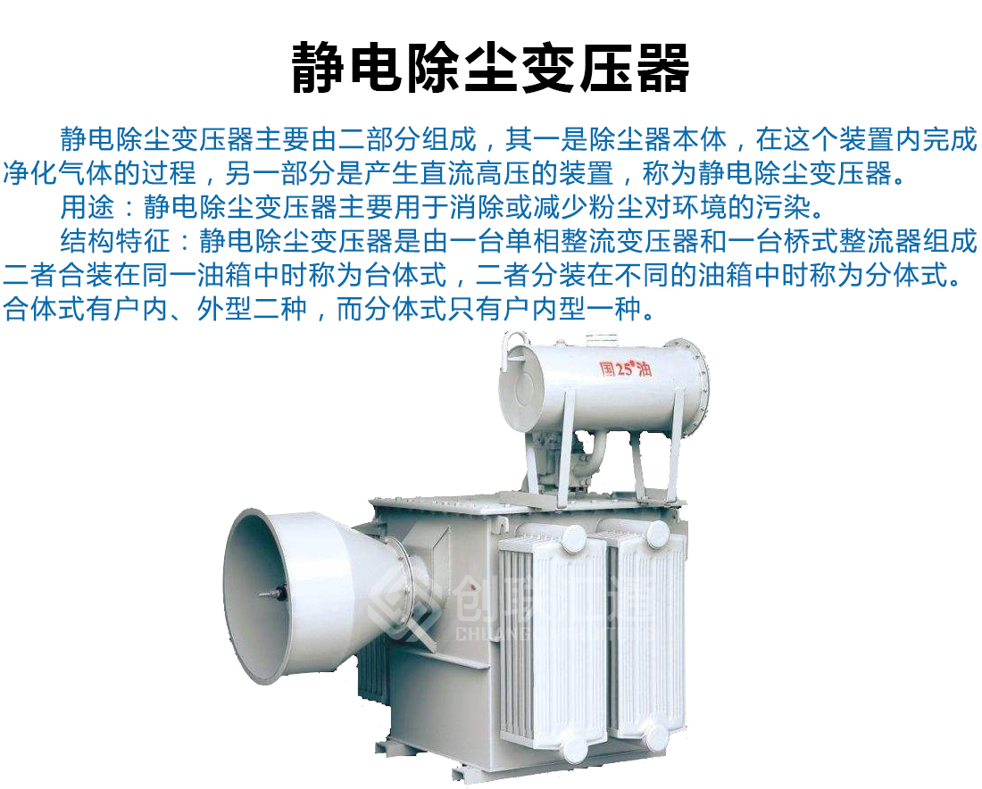 靜電除塵變壓器適合于工業(yè)部門的除塵、除霧、脫水、雜質(zhì)分離和回收稀有金屬及其他原料等方面應(yīng)用。